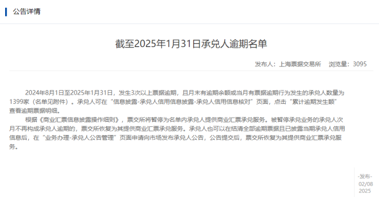 近日,上海票据交易所例行发布《截至2025年1月31日承兑人逾期名单》。公告显示,自2024年8月1日至2025年1月31日,发生3次以上票据逾期,且月末有逾期余额或当月有票据逾期行为发生的承兑人数量共计1399家。