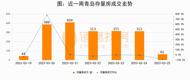 从存量房来看,2023年03月25日青岛存量房单日成交62套,比昨日减少250套,环比下降80.1%。从近一周存量房成交来看,青岛存量房日均成交套数为263套,03月25日单日成交62套,低于近一周平均水平76.4%。
