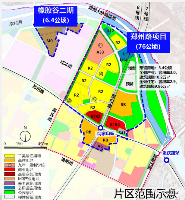 郑州路片区位于李村河以南,郑州路两侧,地铁5、7、8号线通过该区域,占地约76公顷。片区内项目用地,面积59.14公顷,规划建筑面积135万平方米。主要涉及闫家山、香里的村庄改造用地,运用TOD开发模式,建设集科研总部、贸易金融于一体的高端新材料产业集聚区。
