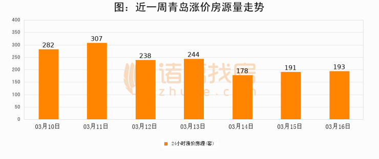 根据诸葛找房数据显示,青岛24小时涨价房源量为193套,较03月15日增加2套,环比上涨1%。与此同时,涨价房源占比小幅扩大,业主信心有所提升。