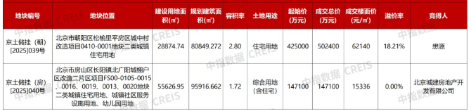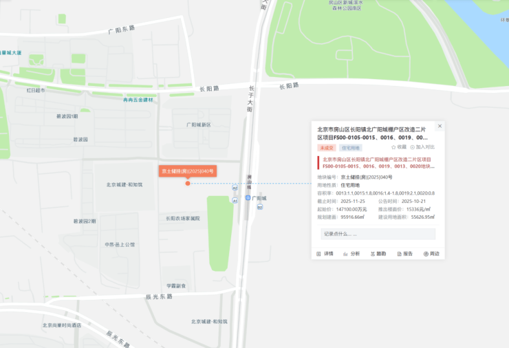 北京市房山区长阳镇北广阳城棚户区改造二片区项目FS00-0105-0015、0016、0019、0013、0020地块二类城镇住宅用地、城镇社区服务设施用地、幼儿园用地,编号京土储挂(房)[2025]040号,建设用地面积55626.95平方米,规划建筑面积95916.662平方米,容积率1.72,起始价14.71亿元,综合起始楼面价15336元/平方米。最终该地块由北京城建房地产开发有限公司以总价14.71亿元竞得,综合成交楼面价15336元/平方米(扣除商业、幼儿园、社区服务设施建面后,住宅楼面价约18098元/平方米),溢价率0%。其中,0020地块配建一所12班幼儿园,0013地块配建社区会客厅。0016地块配套1处商业设施,建筑规模不超过总建筑规模的15%,如果0016和0015地块同期入市并统筹平衡指标,需配置商业设施地上建筑规模不超过6500平方米,商业设施应结合轨道站点统筹设置。