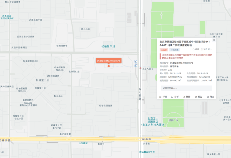 北京市朝阳区松榆里平房区城中村改造项目0410-0001地块二类城镇住宅用地,编号京土储挂(朝)[2025]039号,建设用地面积28874.74平方米, 规划建筑面积80849.272平方米,容积率2.80,限高60m(局部80m),起始价42.5亿元, 起始楼面价52567元/平方米。
