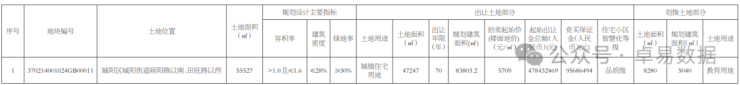 位于城阳区城阳街道硕阳路以南、田旺路以西,占地面积55527㎡,容积率1.6,建筑面积约83803.2㎡,此外还有5040㎡教育用地,起拍楼面地价5709元/㎡,起拍总价4.78亿元,竞买保证金9567万元。