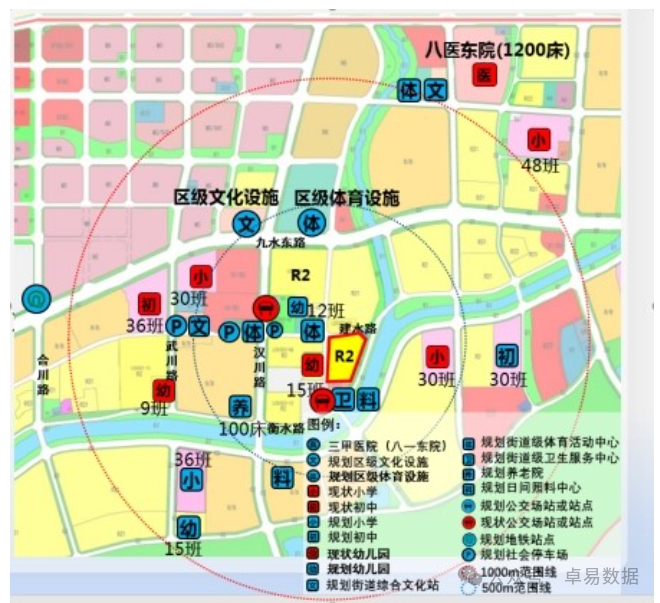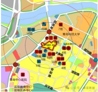 2.教育与医疗:周边现状有39中市北分校(36班,距离约400米),洛一小、洛二小(距离约200米),中海地块6班幼儿园(距离约100米)、4班幼儿园2处(距离约500米),中心医院(三甲医院,距离约1000米),街道卫生服务中心(距离约100米)。规划有捷能地块九年制学校(距离约500米)、30班初中(距离约1000米)、9班幼儿园(距离约200米)、6班幼儿园(距离约300米)、15班幼儿园(距离约500米)。