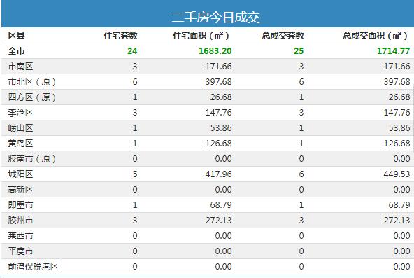 27日全市二手房成25套,总成交面积1714.77㎡,包括住宅24套,成交面积1683.2㎡。(图为各区市住宅交易量数据)