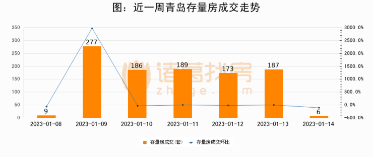 从存量房来看,2023年01月14日青岛存量房单日成交6套,比昨日减少181套,环比下降96.8%。从近一周存量房成交来看,青岛存量房日均成交套数为146套,其中01月09日成交量最高为277套,01月14日单日成交6套,低于近一周平均水平95.9%。