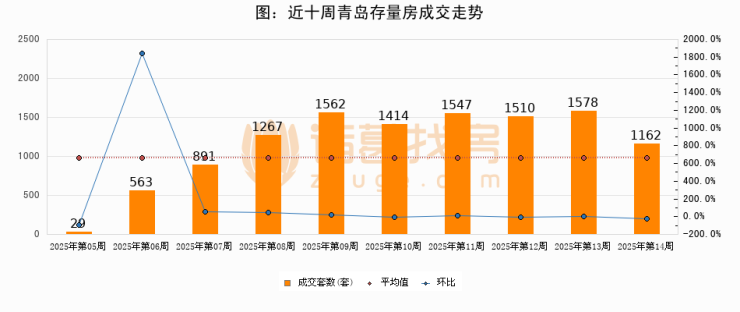 存量房方面,第14周青岛存量房成交1162套,较上周减少416套,环比下降26.4%。从近十周成交走势来看,周均成交套数为1152套,本周高于平均水平0.9%。