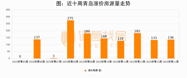 从调价房源来看,第14周青岛涨价房源136套,较上周上涨2.3%。与此同时,14周涨价房源占比提升0.61个百分点,业主信心持续恢复。