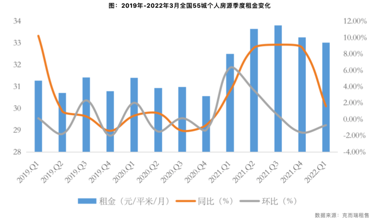 4月15日,据克而瑞租售监测数据显示,2022年一季度,全国55城个人房源租金为33.02元/平方米/月,环比下跌0.72%,同比上涨1.6%,较2021年整体来看,租金上涨幅度明显下降。