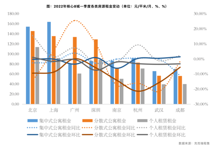 从房源类型来看,无论是集中式公寓还是分散式公寓,或是个人房源,今年一季度8城(即北京、上海、深圳、广州、南京、杭州、武汉和成都)租金呈现普降趋势。