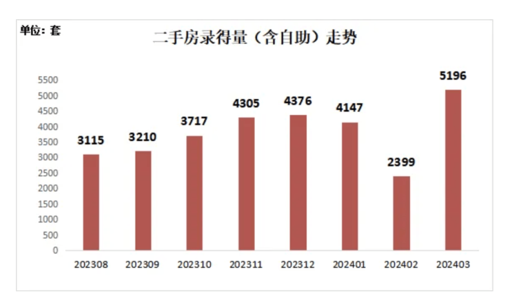 4月1日,根据深圳市房地产中介协会统计,今年3月,深圳全市二手房录得(录得量系指深房中协以二手房买卖合同发起时间为口径统计的数据,并非最终成交过户套数)5196套,环比增长116.6%,同比增长5.1%,已升破5000套行业荣枯线标准。