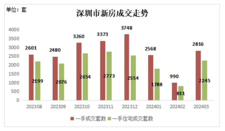 根据深圳市房地产中介协会的统计数据,2024年3月,深圳全市新房住宅成交2245套,环比增长176.8%。