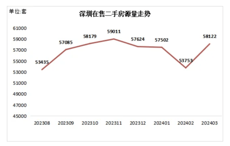 从挂牌量来看,截至2024年4月1日,根据深圳市房地产信息平台公开在售二手房数量统计,深圳全市有效在售二手房源58122套,对比3月1日统计的53753套在售房源增加4369套,环比增长8.1%。春节假期复工后,市场二手房在售量呈现持续增长态势。
