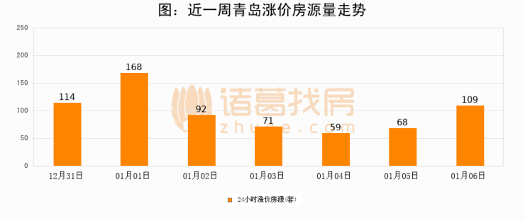 根据诸葛找房数据显示,青岛24小时涨价房源量为109套,较01月05日增加41套,环比上涨60.3%。与此同时,涨价房源占比小幅扩大,业主信心有所提升。