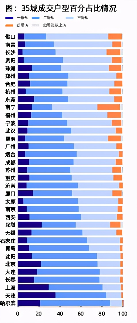 报告研究发现,35个城市中,两居室成为主力交易户型。以北京、上海为代表的一线城市,两居室成交占比较高。三居室成交户型百分占比紧随其后,佛山、南昌及长沙等城市的三居室户型占比较高,除了受供给侧影响外,这几个城市的购房压力相对较低。