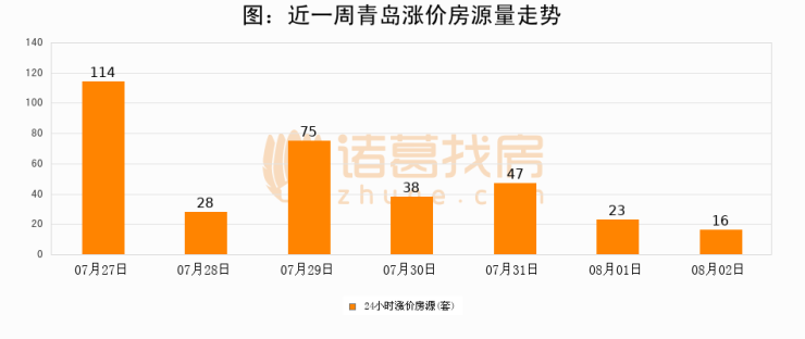 根据诸葛找房数据显示,青岛24小时涨价房源量为16套,较08月01日减少7套,环比下降30.4%。与此同时,涨价房源占比小幅回落,对于购房者来说是一个入市窗口期,购房者可抓住时机入市。