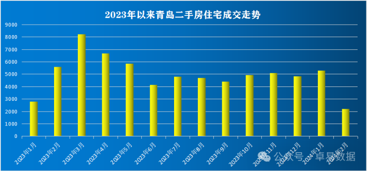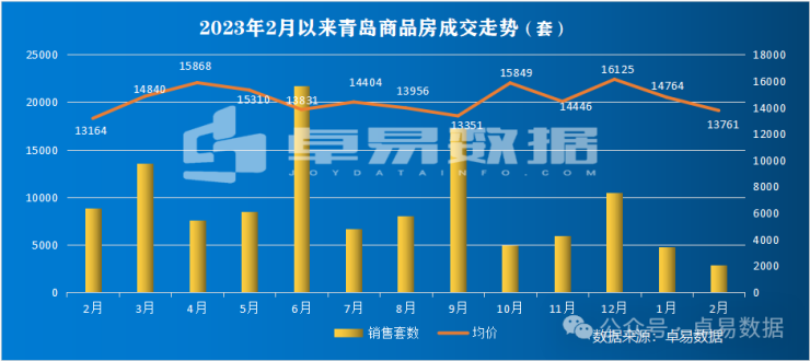 据卓易数据统计:截止到2月28日,青岛新建商品房成交7643套,成交97.17万㎡,成交总价139.87亿;同比去年分别下降39.76%、36.04%和36.18%。