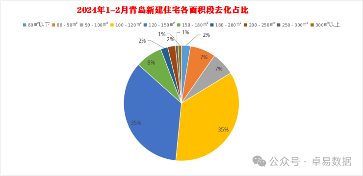 2024年1-2月在全市的商品住宅去化中,从需求结构来看,100㎡以下的占比16%相比2023年下降明显,100-120㎡面积段成交最多占比35.5%,与120-150㎡两个面积段加起来合计约71%。