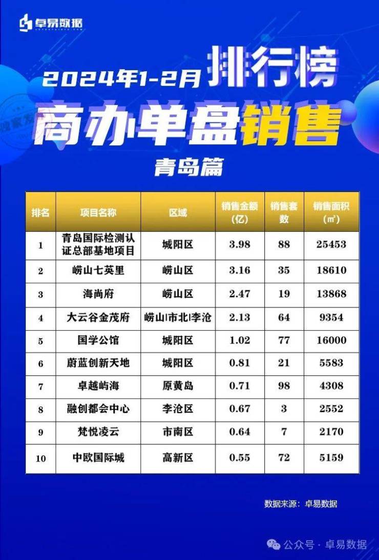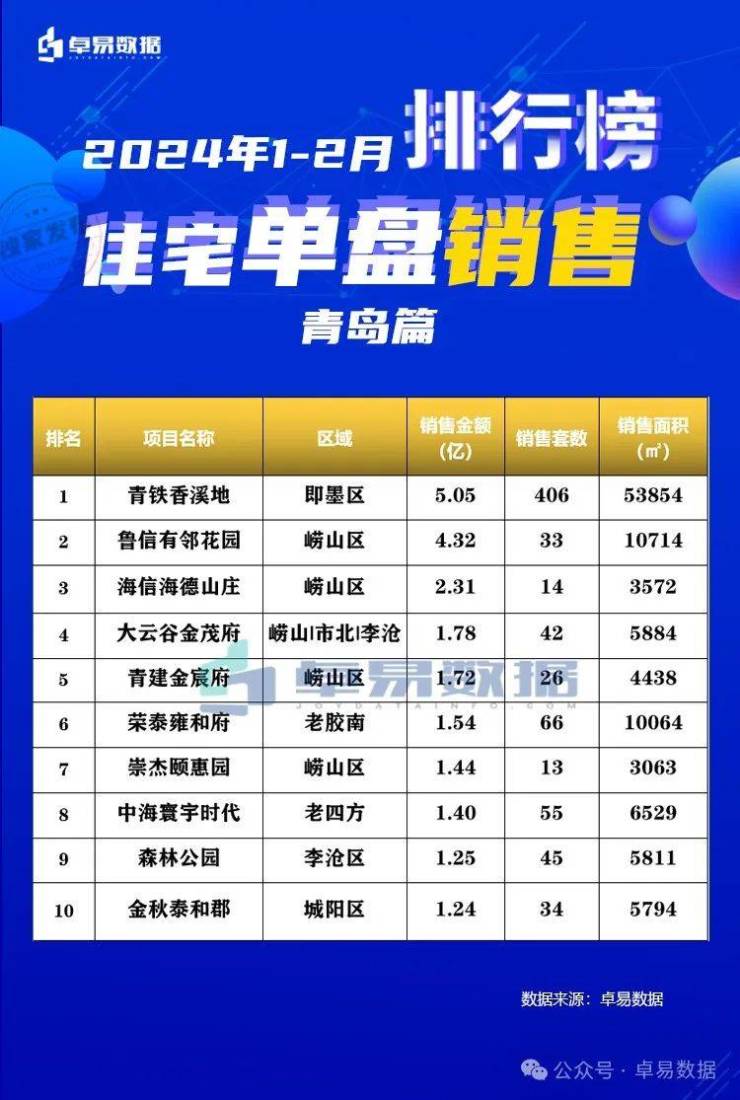 城阳区(含高新区)成交1641套,其中青岛国际检测认证总部基地项目3.98亿、金秋泰和郡1.24亿、国学公馆1.02亿、保利大国璟未来之城1亿、星河湾0.95亿。