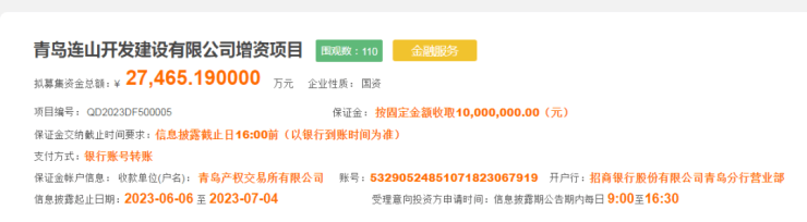 近日,青岛连山开发建设有限公司发布增资公告,拟募集资金2.75亿,相比4月份发布的增资公告2.66亿上涨826万。信息披露日期2023-06-06 至 2023-07-04。