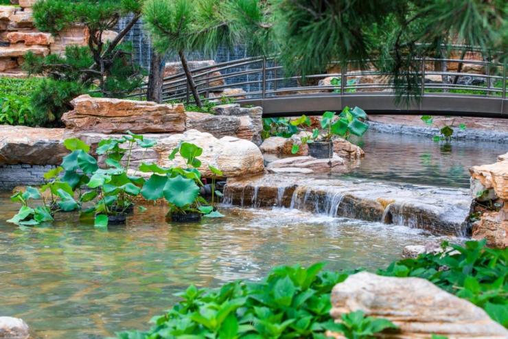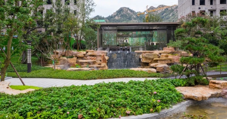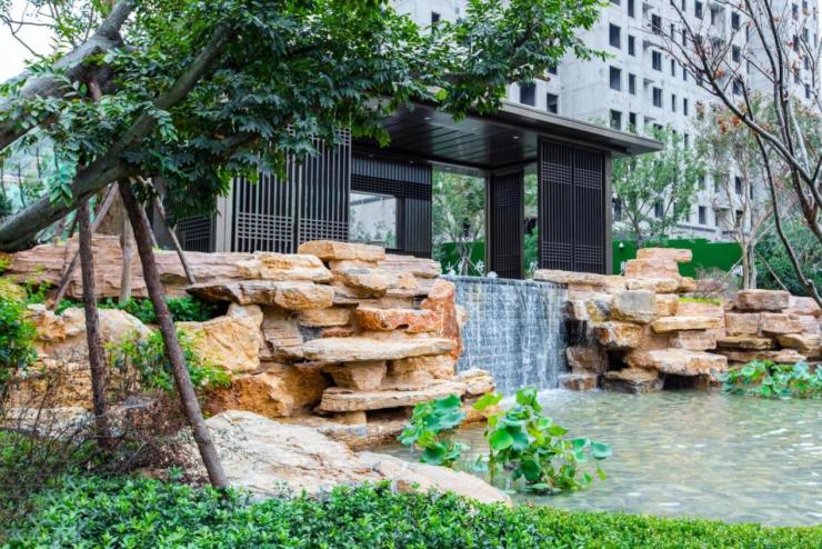 之所以把鑫江·瑞府归结于府院系,这与它的鑫派特色园林是分不开的。从古至今,中式园林建筑美学一直凝聚着国人骨子里的居住情结,其亲近自然的儒雅惬意是很多人一生的终极追求。鑫江·瑞府,汲取东方建筑美学之精髓,承大家造园之修为,将宋代传统技法与艺术设计相结合,通过对“辋川别业”山水田园格局以及王维“闲适自在”生活哲学的研究,提取“一轴一脉三苑六巷七园”为园林的风景意向,以大地作画,创造诗画意境中的瑞府二十景。园区内绿地率更是达到40%之多,栽植乌桕、紫薇、泰山松等名贵树种,均为100%全冠移植树木。在石材选用方面,鑫江·瑞府寻上乘泰山石,由工匠纯手工锤凿打磨,经验丰富的匠人指导堆叠设计,增加园林艺术的趣味性,匠造出气势磅礴的叠瀑山石景观。步入其中,颇有独处自然胜境中的尊荣感。让居住于此的人,忘却日常繁杂,回归纯真本心。
