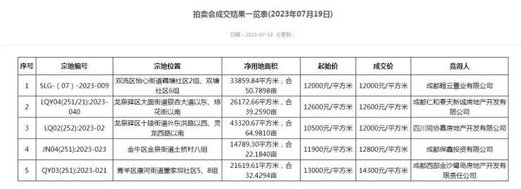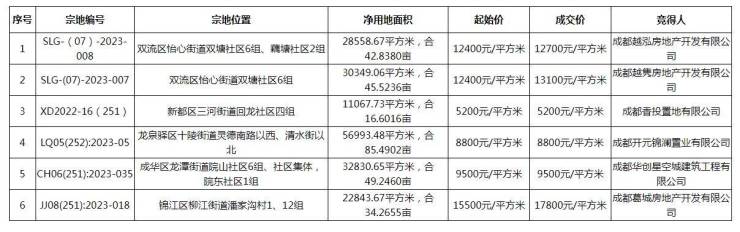 其中,位于龙泉驿区十陵街道灵德南路以西、清水街以北的LQ05(252):2023-05地块由成都开元锦澜置业有限公司以底价100309万元摘得;新都区三河街道回龙社区四组的XD2022-16(251)由成都香投置地有限公司以底价8057万元摘得;成华区龙潭街道院山社区6组、社区集体,院东社区1组的CH06(251):2023-035地块由成都华创星空城建筑工程有限公司以底价62690万元摘得;双流区怡心街道藕塘社区2组、双塘社区6组SLG-(07)-2023-009由成都翰云置业有限公司以底价81263万元摘得;龙泉驿区大面街道银杏大道以东、琼花街以南的LQY04(251/21):2023-040地块由成都仁和春天新诚房地产开发有限公司以底价59360万元摘得。