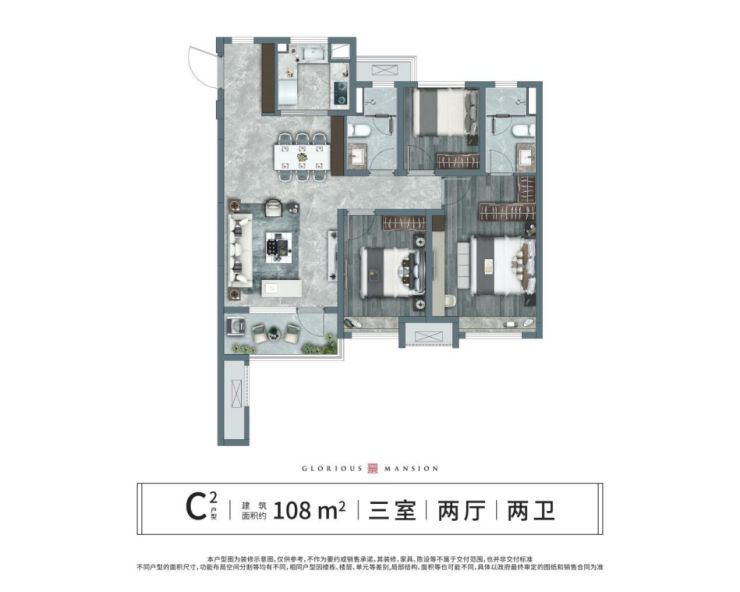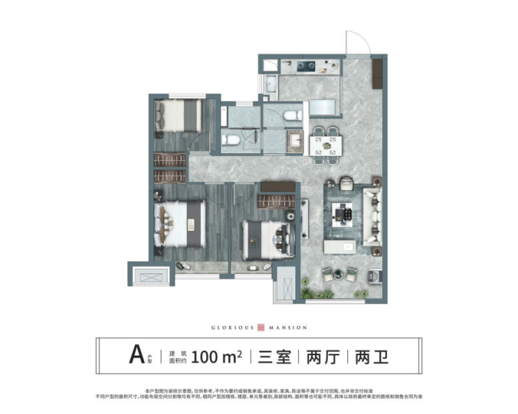 在户型设计上,拥有着板块内同面积段的特别优势;建面约100㎡的户型实现了同面积段行业内罕见的套三双卫功能房,实用性满满!