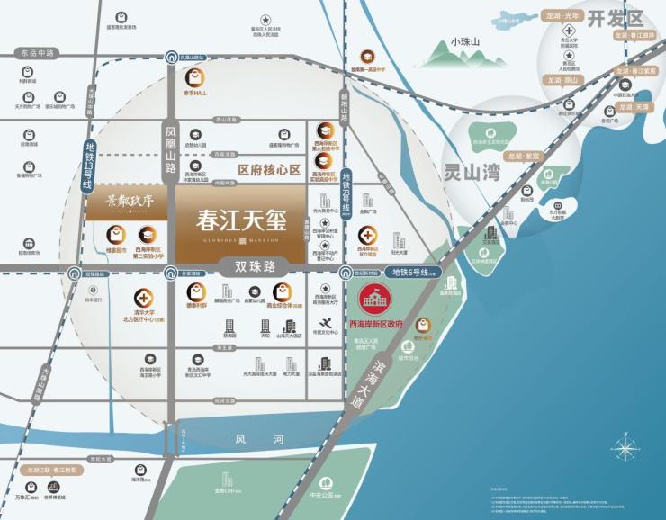 春江天玺目前是区府核心区一公里内少有新售项目,距离西海岸新区政府仅约1公里,紧邻核心主轴双珠路,地铁13号线、地铁6号线(在建)、地铁23号线(规划中)三地铁环伺。
