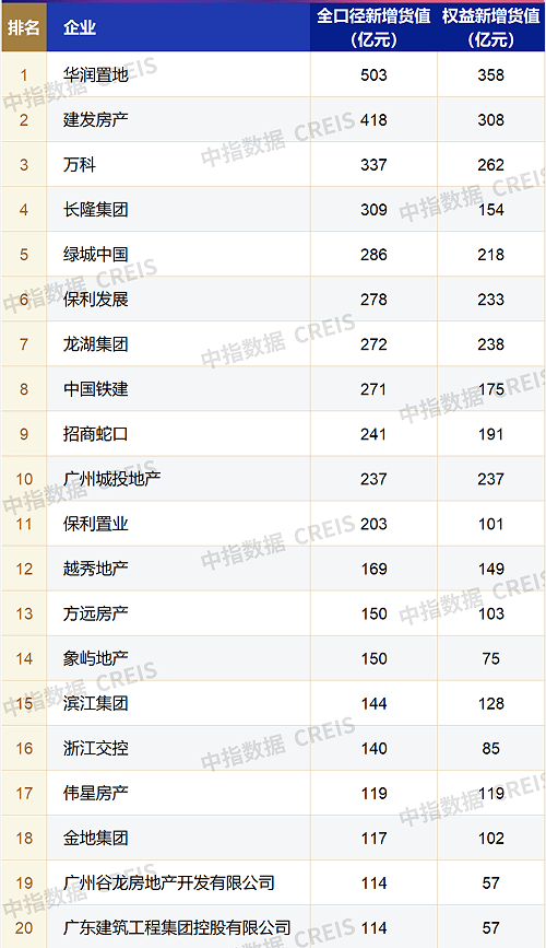 从新增货值来看,今年1-4月华润置地、建发房产、万科占据榜单前三位。华润置地以累计新增货值503亿元占据榜单第一;建发房产、万科紧随其后,累计新增货值规模分别为418亿元和337亿元。