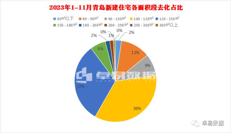 2023年1-11月在全市的商品住宅去化中,从需求结构来看,100㎡以下的占比只有22.8%占比在不断缩小,100-120㎡面积段成交最多占比35.5%,与120-150㎡两个面积段加起来合计约67%。