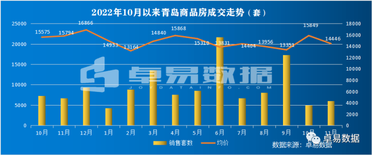 11月青岛新建商品房成交5792套,成交71.41万㎡,成交总价103.15亿;环比10月分别上涨12.16%、17.47%和8.62%;同比去年分别下降8.0%,2.3%、10.4%。其中11月新建住宅成交4361套,均价15294元/㎡。