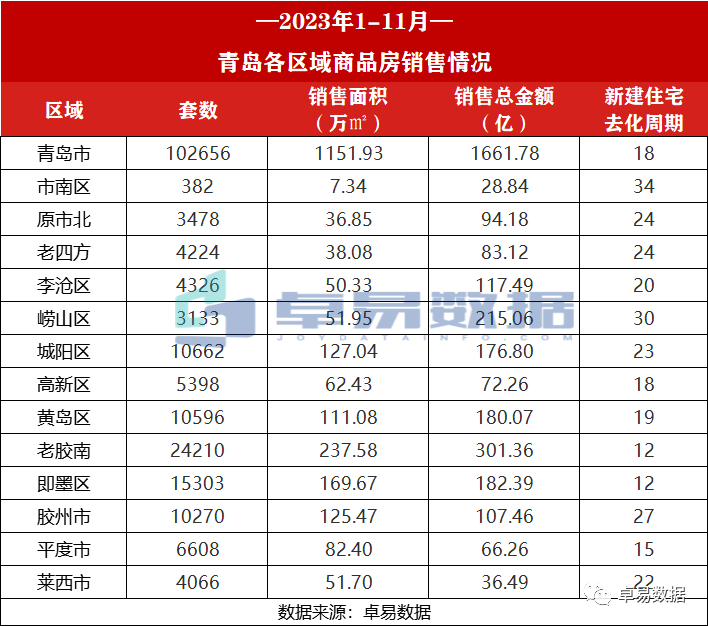 据卓易数据统计:截止到11月29日,2023年1-11月青岛新建商品房网签成交102656套(不含退房),成交面积1151.93万㎡,成交总金额1661.78亿,成交套数相比去年上涨0.9%,成交面积、总金额分别下降3.8%、10.5%。
