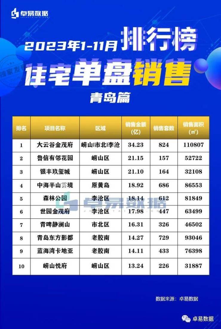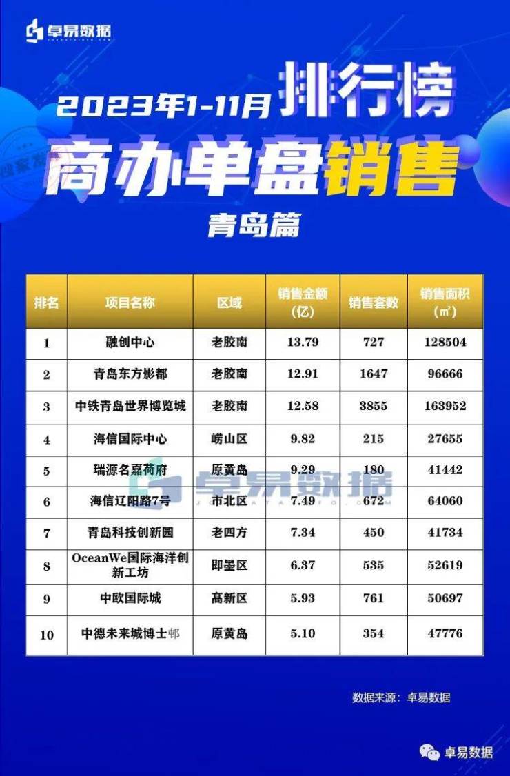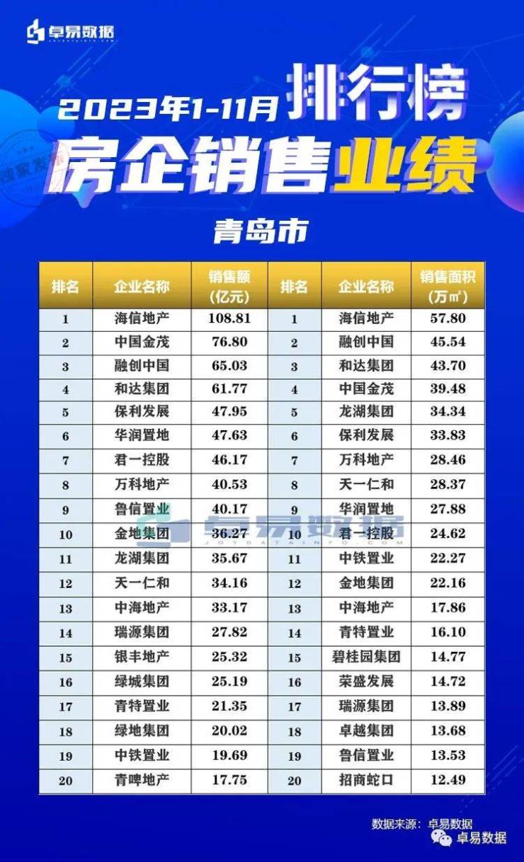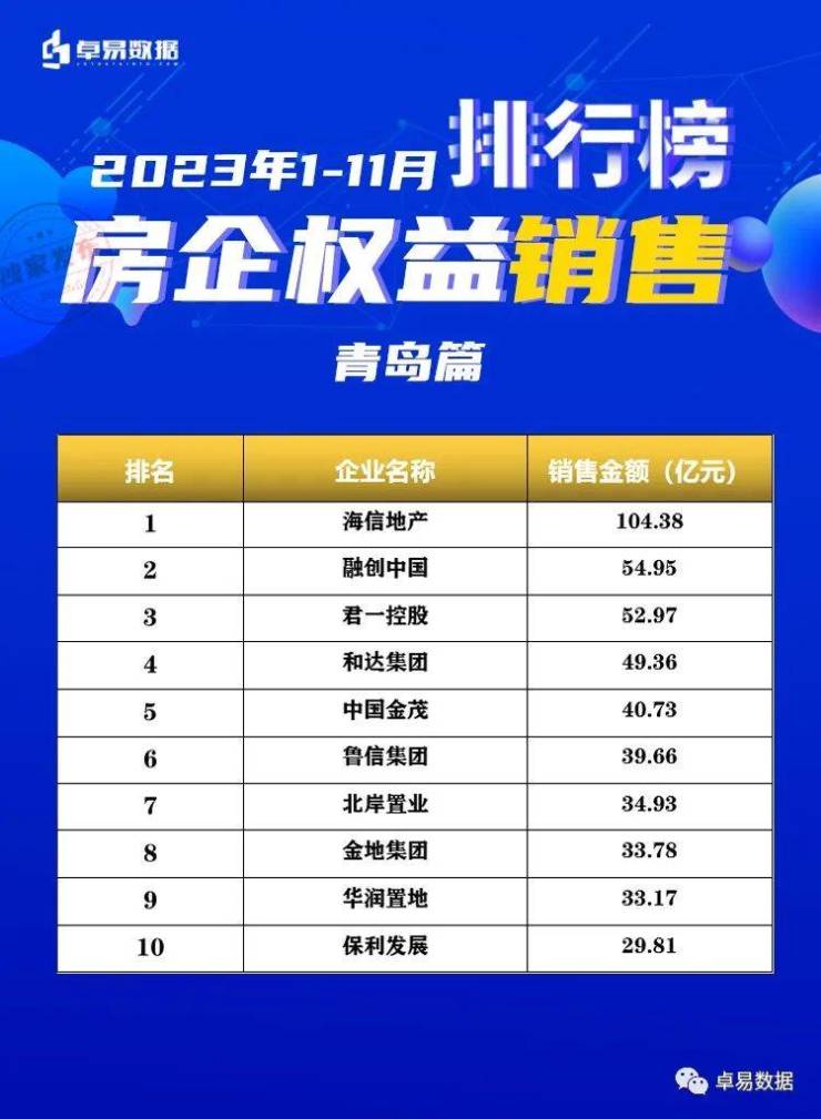 本榜单是根据卓易数据的独立研究,将青岛所有可售项目按照工商注册股权逐一进行权益拆分,剔除重复并表、重复计算的统计方法,展现一个客观的房企商品房销售权益“战绩”,更能清楚一家房企的实际业绩,更好的用于课题研究和监测。