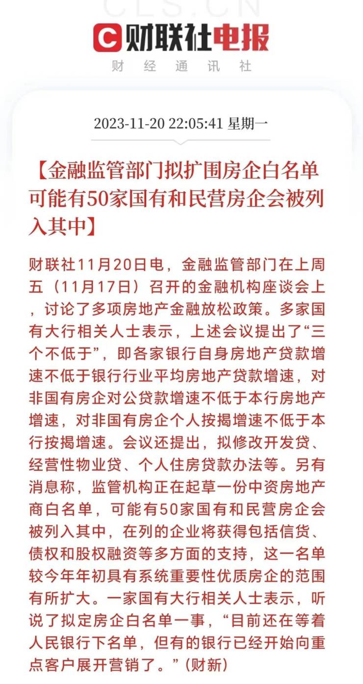 11月金融会议喊出“两个不动摇”: 一要一视同仁满足不同所有制房地产企业合理融资需求,对正常经营的房企不惜贷、抽贷、断贷;二要继续用好“第二支箭”支持民营房企发债融资;