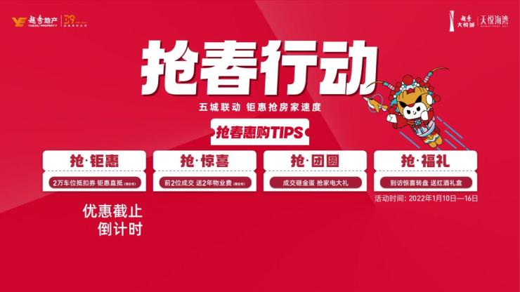 新春惊喜时刻,钜惠必不可少,限量发放两万元车位抵扣券(限住宅),惊喜好价难得,钜惠实实在在;钜惠再加码,物业费直送,活动期间前两位成交住宅客户,即刻享受直送两年物业费优惠;团圆时刻,金蛋好礼升级,凡是成交客户即可享受砸金蛋,赢取家电好礼;福利再膨胀,到访惊喜大转盘,送品质红酒礼盒,只要你来,好礼不停,让暖冬时节的越秀大悦城·天悦海湾用重重好礼,重重惊喜,和你一起开启美好新春。