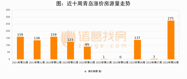 从调价房源来看,第8周青岛涨价房源275套,较上周上涨9066.7%。与此同时,8周涨价房源占比提升0.52个百分点,业主信心持续恢复。