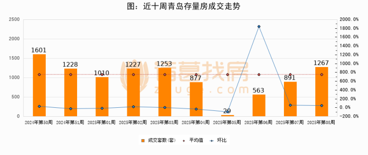 存量房方面,第08周青岛存量房成交1267套,较上周增加376套,环比上涨42.2%。从近十周成交走势来看,周均成交套数为994套,本周高于平均水平27.5%。