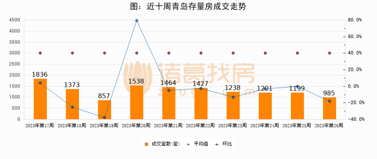 存量房方面,第26周青岛存量房成交985套,较上周减少214套,环比下降17.8%。从近十周成交走势来看,周均成交套数为1311套,本周低于平均水平24.9%。