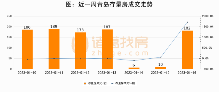 从存量房来看,2023年01月16日青岛存量房单日成交182套,比昨日增加172套,环比上涨1720%。从近一周存量房成交来看,青岛存量房日均成交套数为133套,其中01月11日成交量最高为189套,01月16日单日成交182套,高于近一周平均水平36.8%。