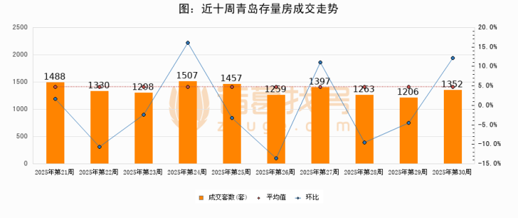 存量房方面,第30周青岛存量房成交1352套,较上周增加146套,环比上涨12.1%。从近十周成交走势来看,周均成交套数为1355套,本周低于平均水平0.2%。