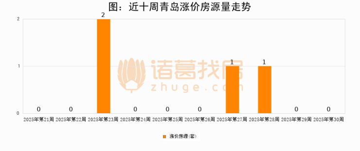 从调价房源来看,第30周青岛涨价房源0套,较上周持平。与此同时,30周涨价房源占比持平