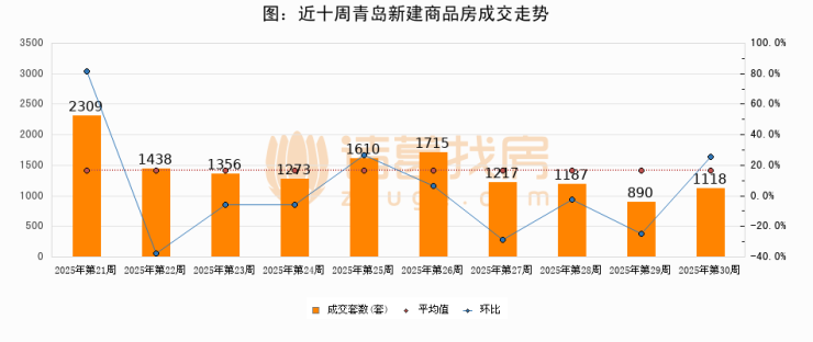 进入2025年第30周(07月21日-07月27日),青岛新建商品房成交1118套,较上周增加228套,环比上涨25.6%