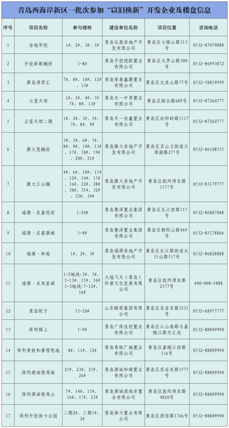 西海岸一批次参加“以旧换新”17个项目 含保利|金地|瑞源|荣泰|天一仁和等