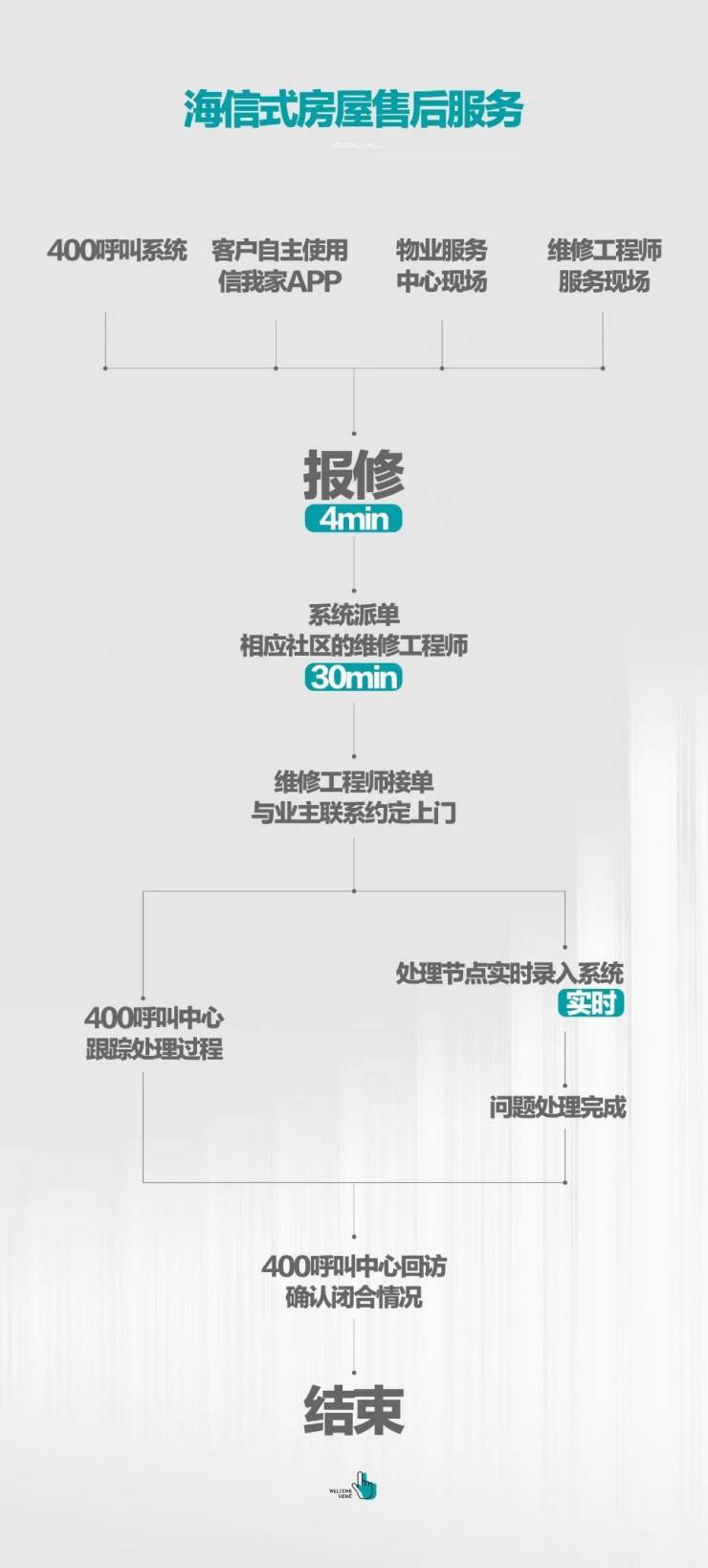 为什么海信地产的房子更保值?体验过海信地产房屋售后和物业服务后便得到了答案。为尽力保障业主居住舒适度,及时响应业主的需求,海信地产搭建了全时400呼叫系统。如业主有维修诉求,海信地产能够实现4分钟内落实诉求录入工单,30分钟内接单,2小时内登门,力争1天内解决问题,200%维修登门率。还有专属线上社区平台“信我家”APP实时报修、实时反馈,全流程可追溯,业主一目了然。让我们来看看什么是海信式房屋售后服务。