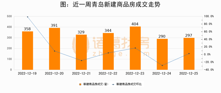 根据青岛市住房和城乡建设局数据显示,2022年12月25日青岛新建商品房成交297套,较昨日增加7套,环比上涨2.4%