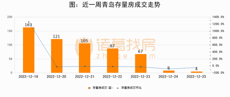 从存量房来看,2022年12月25日青岛存量房单日成交4套,比昨日减少4套,环比下降50%。从近一周存量房成交来看,青岛存量房日均成交套数为79套,其中12月19日成交量最高为163套,12月25日单日成交4套,低于近一周平均水平94.9%。