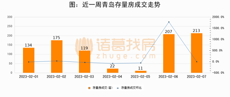 从存量房来看,2023年02月07日青岛存量房单日成交213套,比昨日增加6套,环比上涨2.9%。从近一周存量房成交来看,青岛存量房日均成交套数为125套,其中02月07日成交量最高为213套,02月07日单日成交213套,高于近一周平均水平70.4%。
