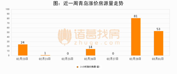 根据诸葛找房数据显示,青岛24小时涨价房源量为53套,较02月28日减少28套,环比下降34.6%。与此同时,涨价房源占比小幅回落,对于购房者来说是一个入市窗口期,购房者可抓住时机入市。