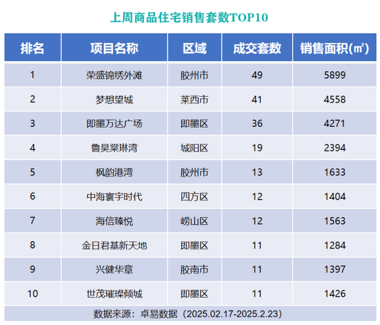 从各项目成交套数来看,位于胶州市的荣盛锦绣外滩以成交49套的成绩列榜单首位;位于莱西市的梦想望城以成交41成绩上榜第二位;位于即墨区的即墨万达广场以成交36套的成绩列榜单第三位。