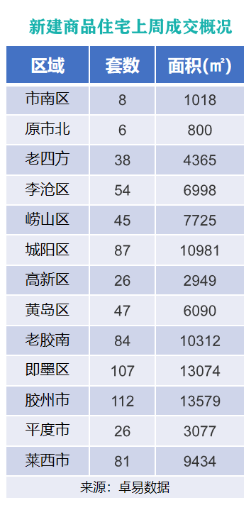 从各区成交情况来看,上周胶州市新建商品住宅以成交面积13579㎡的成绩,位列上周各片区新建商品住宅成交面积榜首位;即墨区以成交面积13074㎡的成绩,位列成交面积榜第二位;城阳区以成交面积10981㎡的成绩,位列成交面积榜第三位。